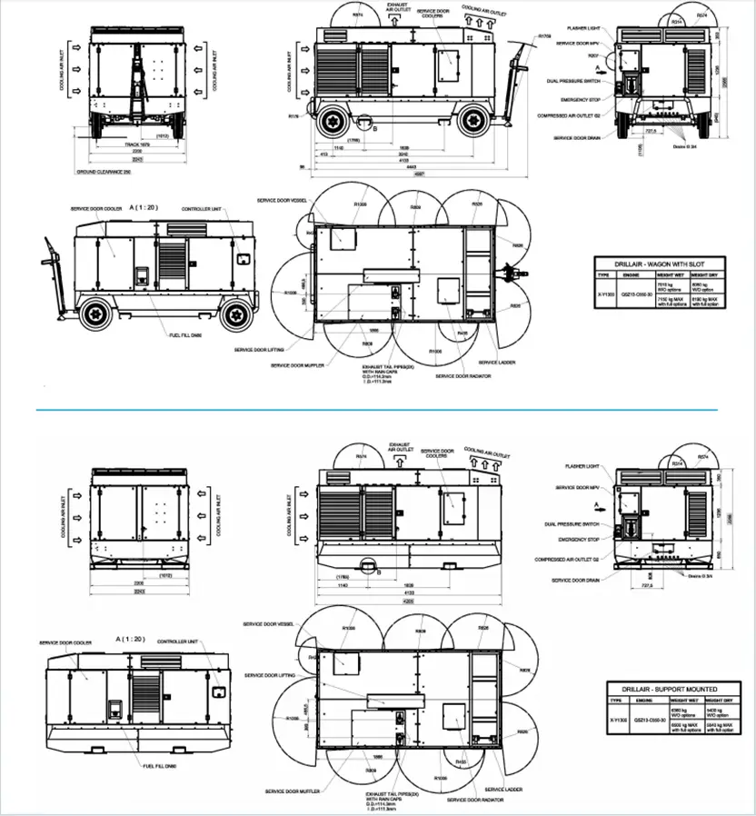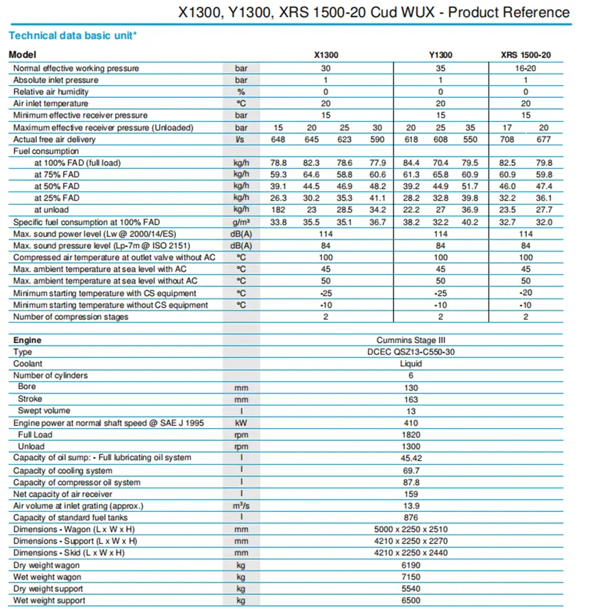 Atlas Copco X1300, Y1300 i XRS 1500-20 to wyciszone, dwustopniowe sprężarki śrubowe z wtryskiem oleju, napędzane chłodzonym cieczą, sześciocylindrowym silnikiem wysokoprężnym Cummins.