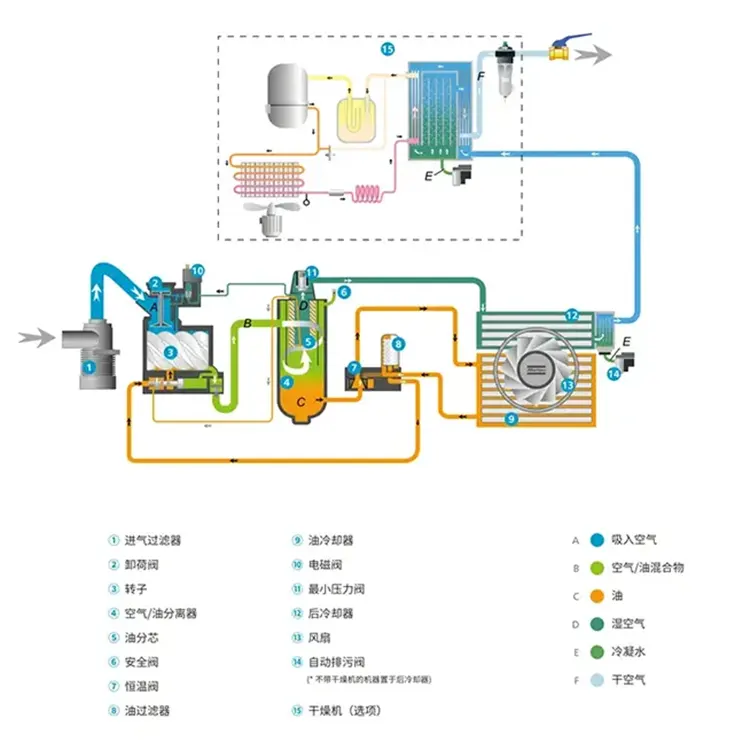 1. Etap rozruchu: Po naciśnięciu przycisku zasilania elektroniczny układ sterowania automatycznie uruchomi układ smarowania i układ wody chłodzącej sprężarki powietrza. Jednocześnie otwiera się zawór wlotowy i powietrze dostaje się do wnętrza jednostki głównej.