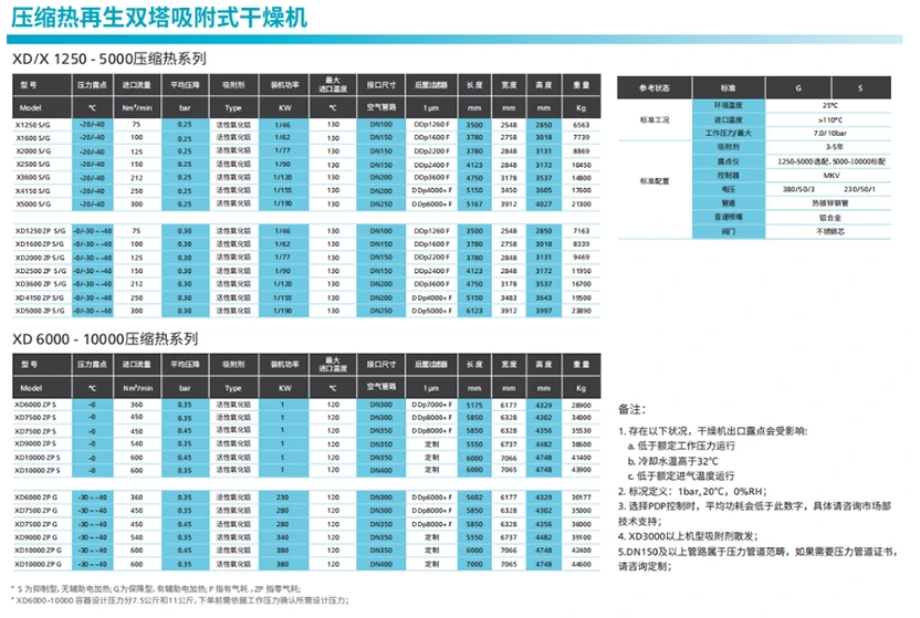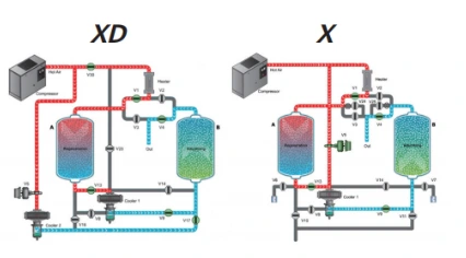 Osuszacze kompresyjne adsorpcyjne na ciepło XD lub X wykorzystują wysokiej jakości adsorbenty i efektywnie wykorzystują ciepło sprężania ze sprężarki bezolejowej do regeneracji adsorbentu, znacznie zmniejszając zużycie energii i koszty konserwacji.