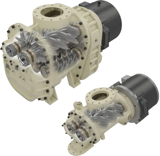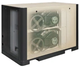 Światowej klasy bloki śrubowe jedno- i dwustopniowe (dwustopniowe dostępne od 90 kW) wraz z silnikiem indukcyjnym TEFC lub opcjonalnym silnikiem o zmiennej prędkości obrotowej minimalizują zużycie energii.