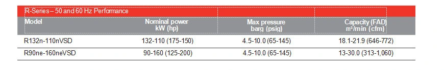 Nasza sprężarka nowej generacji z serii R zawiera zupełnie nowy, najnowocześniejszy stopień sprężający, co czyni ją najlepszym wyborem pod względem wydajności. Nowy stopień sprężający poprawia wydajność dzięki kilku udoskonaleniom, w tym zoptymalizowanemu profilowi wirnika, który pomaga zminimalizować koszty operacyjne.