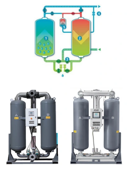 Osuszacze adsorpcyjne regeneracyjne z mikrociepłem serii A wykorzystują środek osuszający do pochłaniania wilgoci ze sprężonego powietrza. Każda maszyna składa się z dwóch identycznych wież. Zamieniają funkcje po każdym cyklu.
