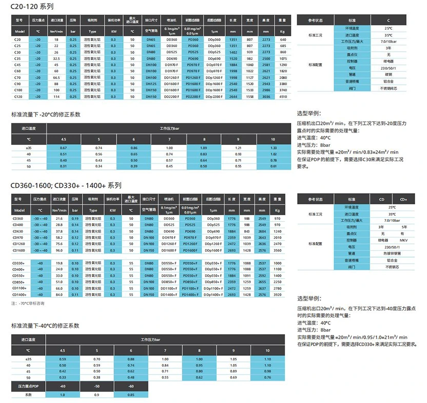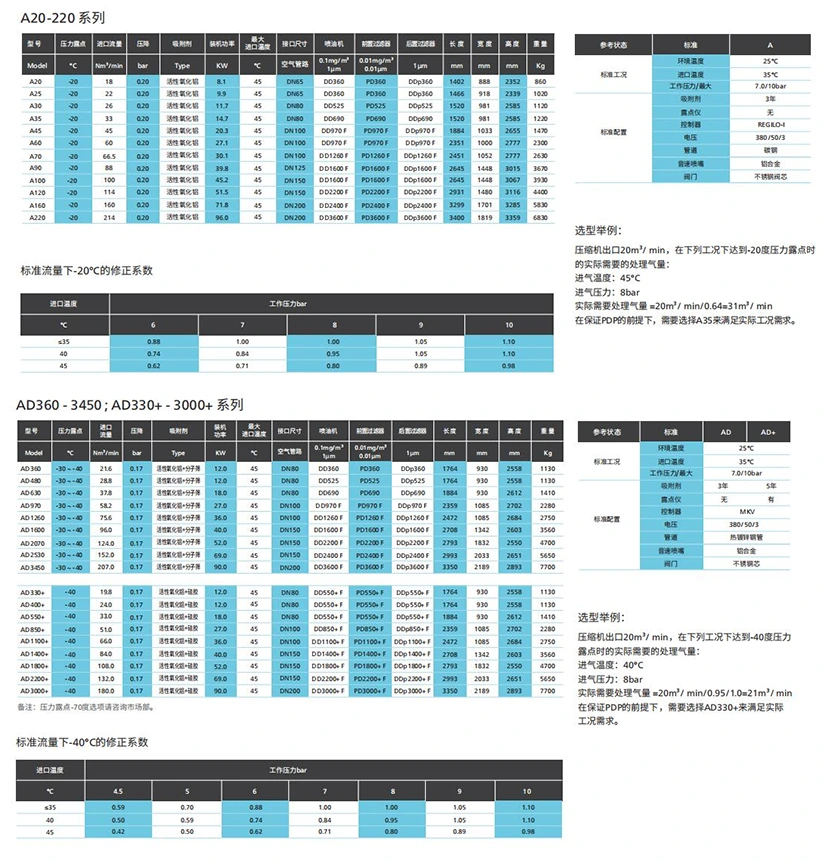 W zależności od ciśnieniowego punktu rosy środkiem osuszającym może być tlenek glinu lub sita molekularne. Najniższy ciśnieniowy punkt rosy może osiągnąć -70°C.