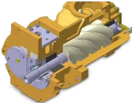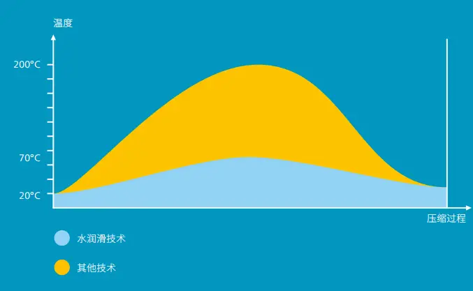 Unikalny dwuślimakowy wirnik sprężarki serii AQ z wtryskiem wody, wydajna praca zbliżona do sprężania izotermicznego. Wirnik z kompozytu polimerowego o bardzo wysokiej wytrzymałości, zoptymalizowany profil wirnika i łożyska smarowane wodą zapewniają, że wirnik nie jest zanieczyszczony olejem i wytwarza czyste, wolne od oleju sprężone powietrze.