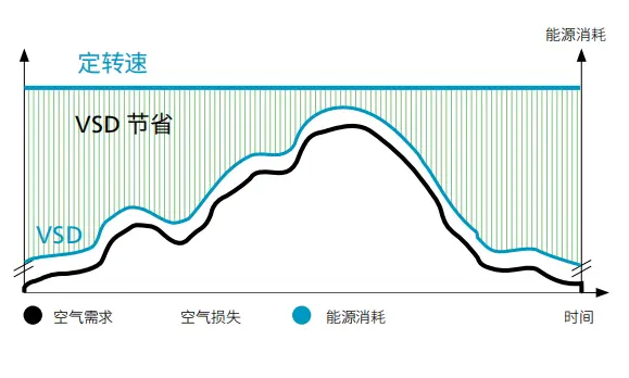 Zużycie energii przez sprężarkę stanowi ponad 70% kosztów całego cyklu życia, a produkcja sprężonego powietrza pochłania ponad 40% całkowitego rachunku za energię elektryczną instalacji. Aby zmniejszyć zużycie energii, firma Atlas Copco opracowała bezolejową sprężarkę powietrza smarowaną wodą VSD. Technologia VSD nie tylko oszczędza dużo energii, ale także chroni środowisko dla przyszłych pokoleń. Dzięki ciągłym inwestycjom w tę technologię firma Atlas Copco oferuje szeroką gamę napędów o zmiennej prędkości (VSD) sprężarki powietrza dostępne na rynku.